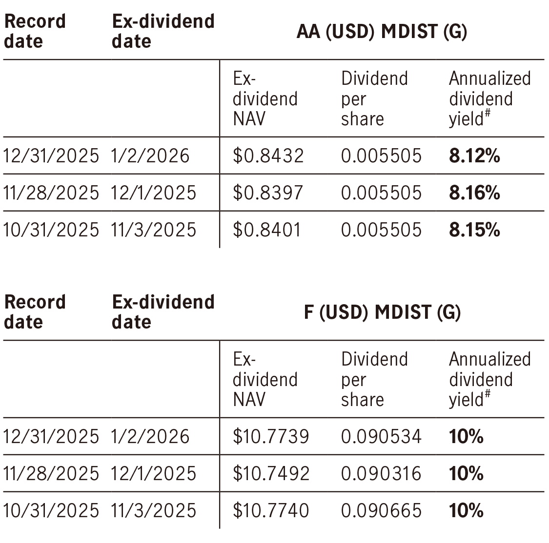 # Dividend rate is not guaranteed. Dividends may be paid out of capital. Refer to important note 2. Please note that a positive distribution yield does not imply a positive return. Investors should not make any investment decision solely based on information contained in the table above. You should read the relevant offering document (including the keyfacts statement) of the fund for further details including the risk factors. Past performance is not indicative of future performance. Annualized yield = [(1+distribution per unit/exdividend NAV)^distribution frequency]–1, the annualized dividend yield is calculated based on the latest relevant dividend distribution with dividend reinvested, and may be higher or lower than the actual annual dividend yield. Annualized fixed percentage of fixed yield monthly distributing share class “Class F MDIST(G)” of this fund is 10%.