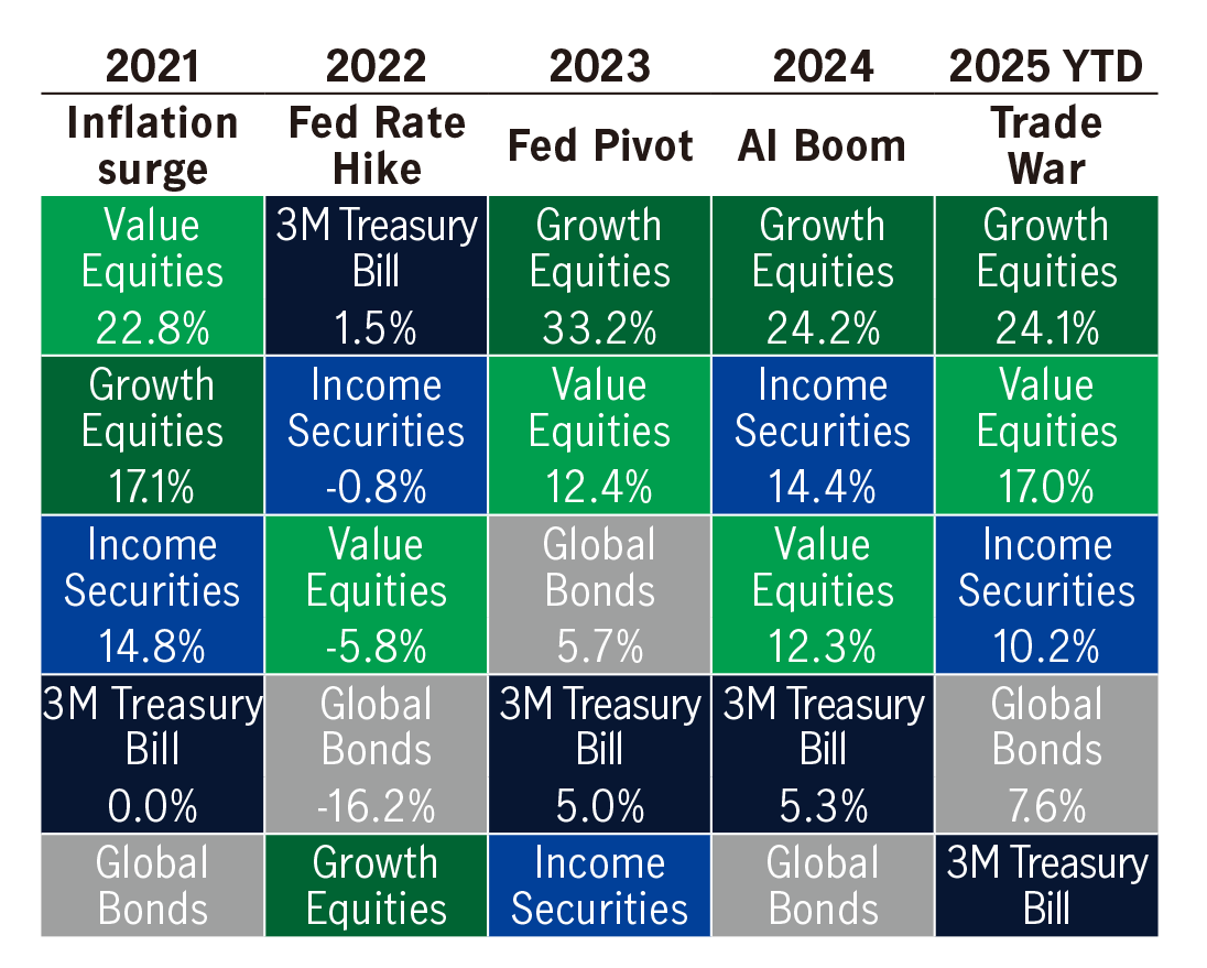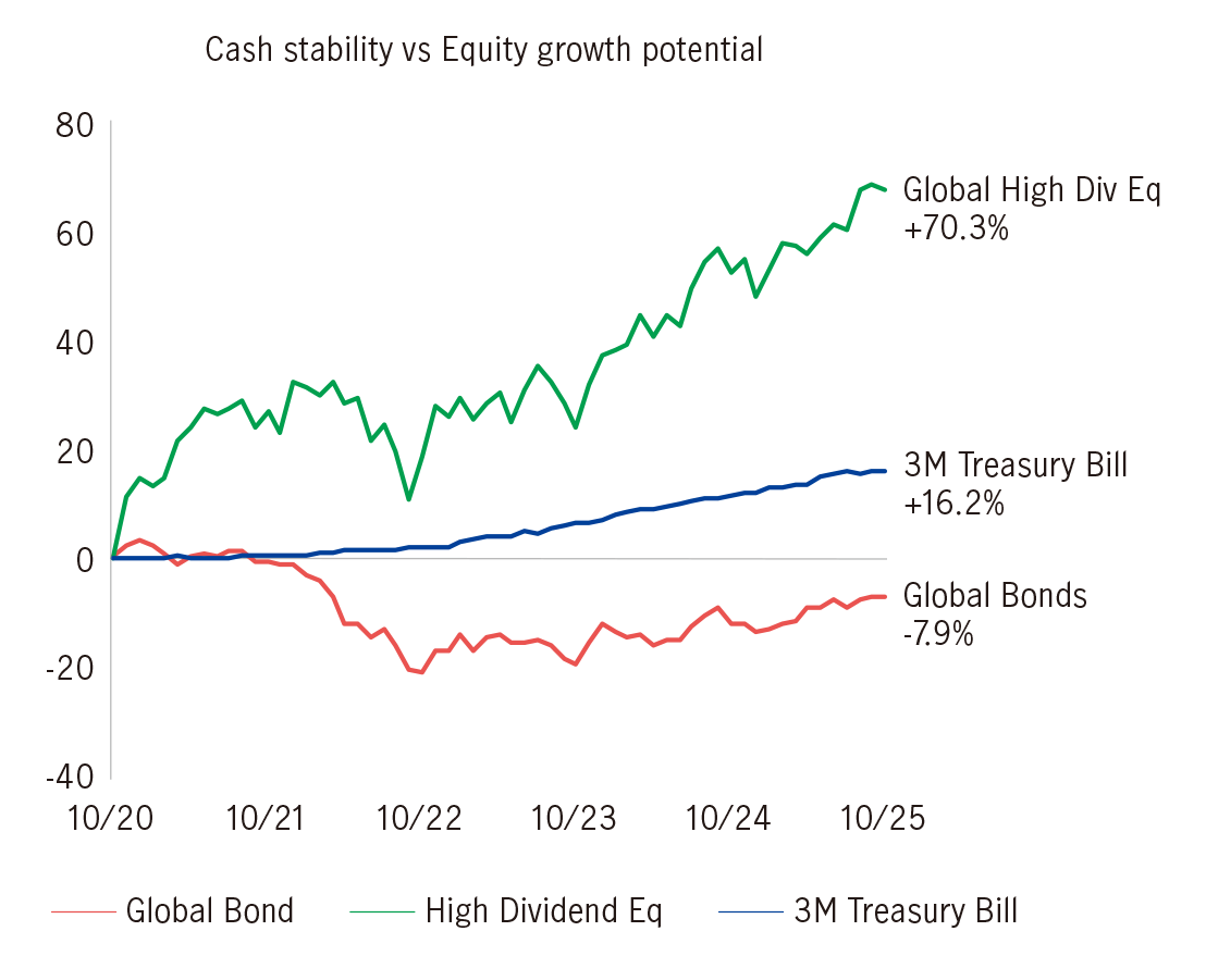Source: Manulife Investment Management, Bloomberg, as of 31 October 2025. Past performance is indicative of future results. There is no guarantee that any investment strategy will achieve its objectives. Global High Div Eq measured by MSCI World High Dividend Index; 3M Treasury Bill measured by ICE BofA 3M US Treasury Bill index; Global Bonds measured by Bloomberg Global Aggregate Index; Global equity measured by MSCI World index; Growth Equities represented MSCI ACWI Growth Index. Value Equities represented by MSCI World Value Index. Income Securities represented by John Hancock Tax-Advantaged Dividend Income Fund (unlevered).