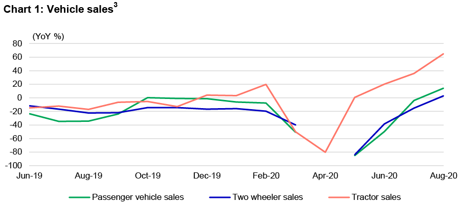 3 CEIC, Kotak Institutional Equities, as of 12 September 2020. The April 2020 data for ppassenger vehicle and two-wheeler were not released by the "Society of Indian Automobile Manufacturers".