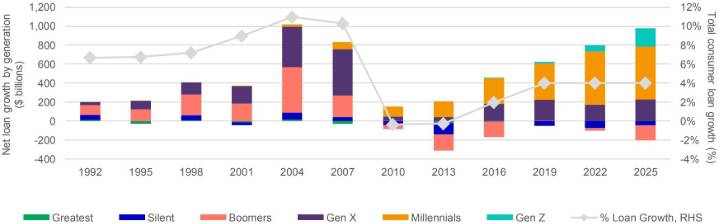 Net loan growth by generation ($ billions) vs. total consumer loan growth (%)