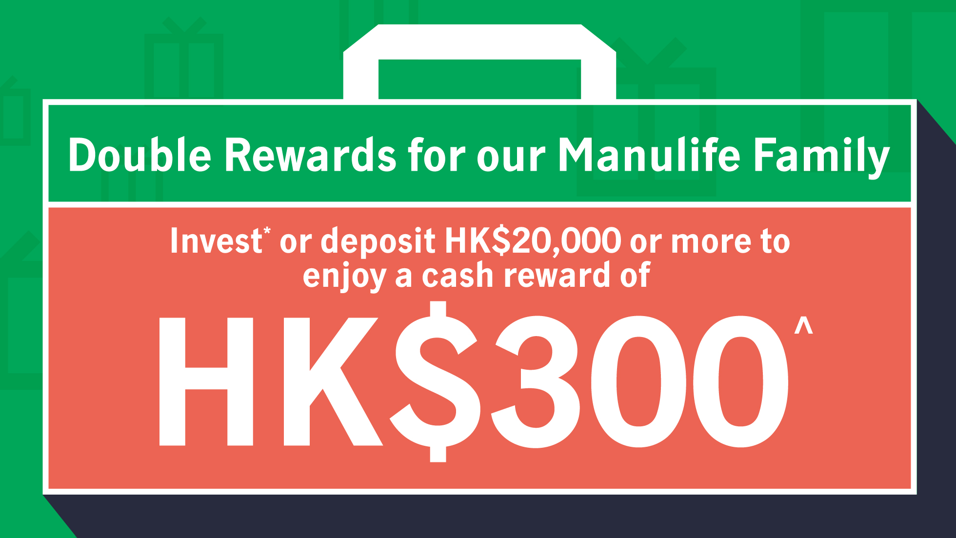 Open a new Manulife InvestChoice account and invest* or deposit HK$20,000 or more to enjoy a cash reward of HK$300.^