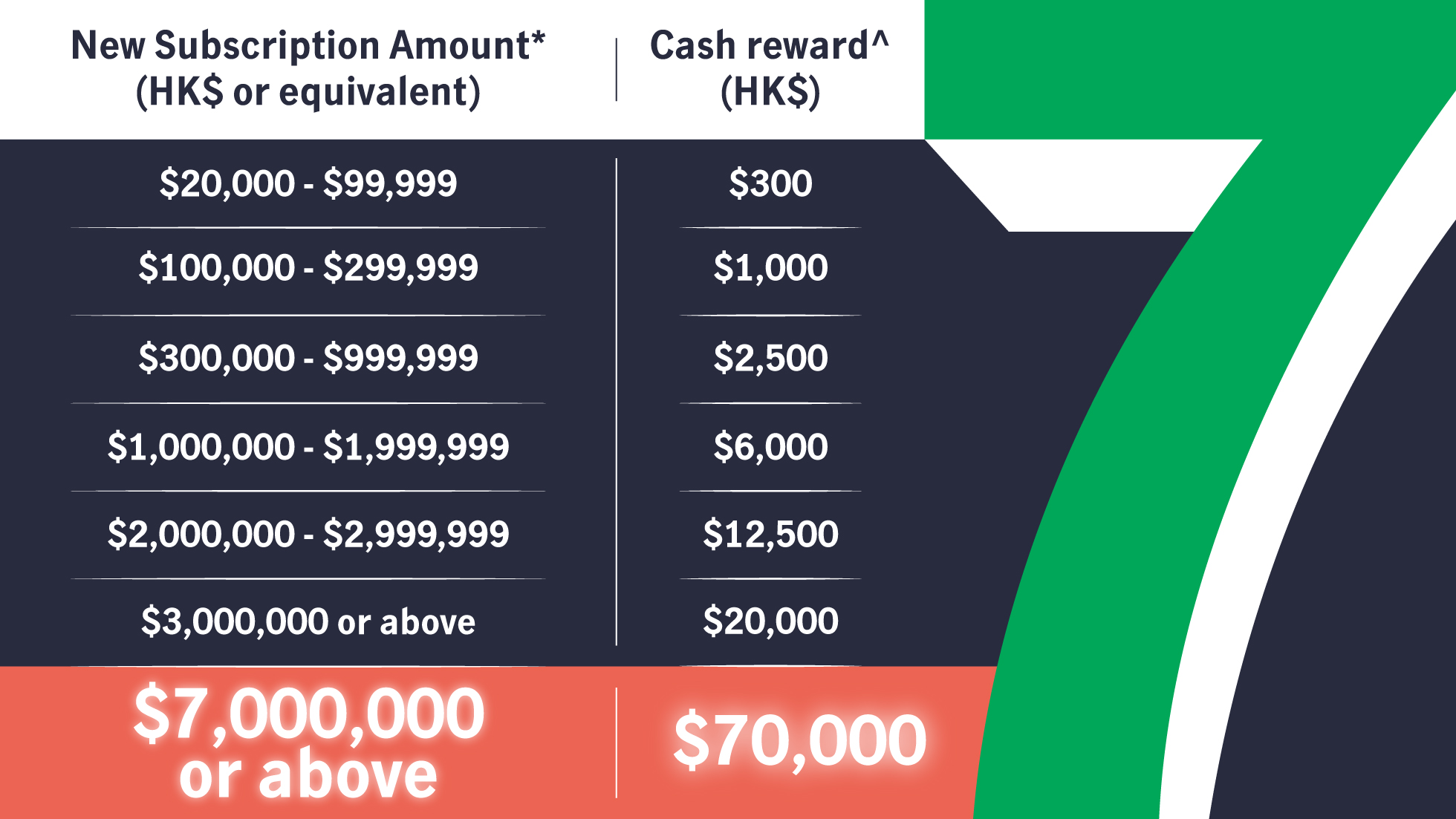 The first 3 privileged customers whose cumulative new subscription amount* reaches HK$7,000,000 or more will enjoy an exclusive cash reward of up to HK$70,000!^