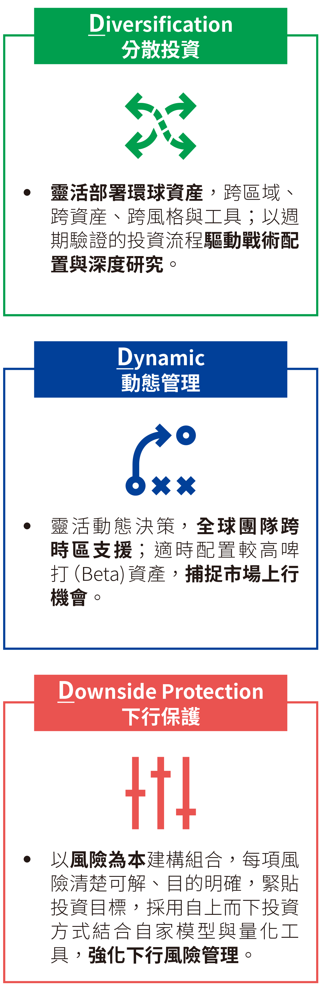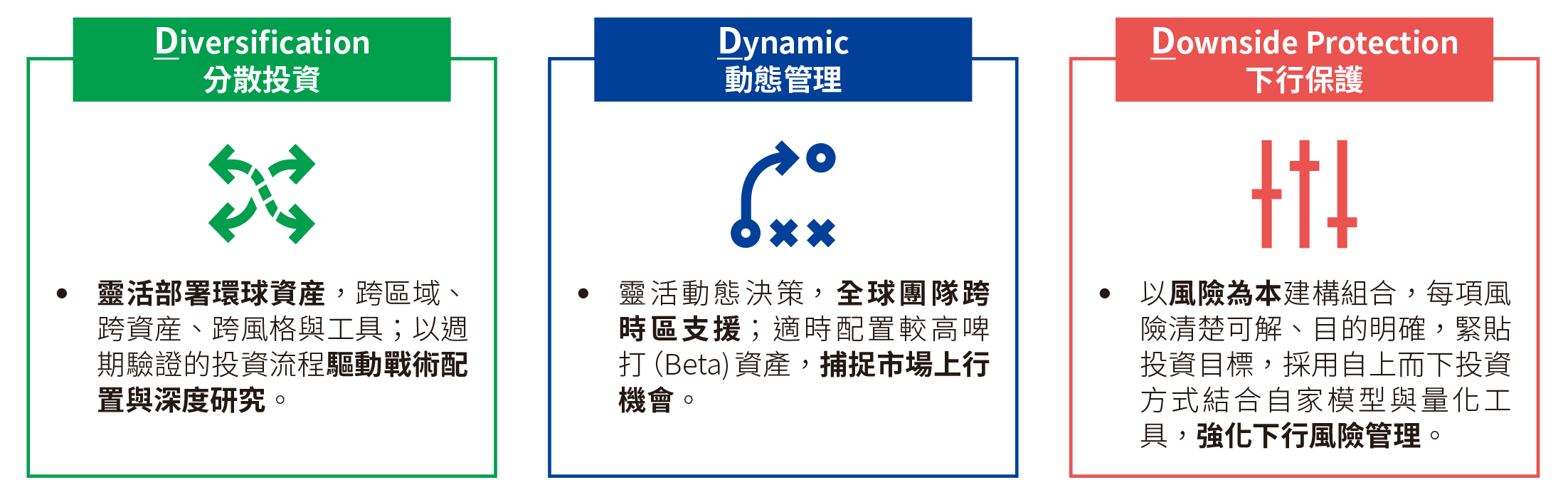 動態佈局多元資產,聚焦長期資本增值與整體回報;力求較純股票策略更低波幅;在收益環境轉弱時,以環球多元回報來源提升分散效益,增強表現潛力。