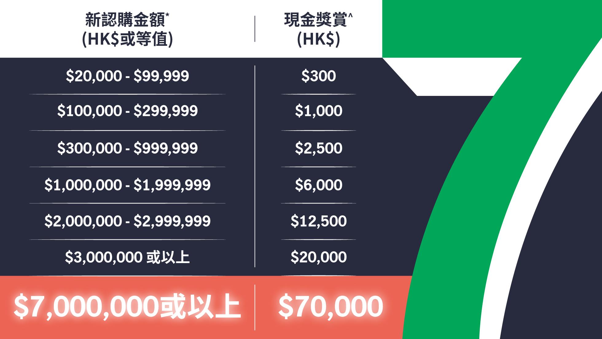 首3名累積新認購金額*達HK$7,000,000或以上的尊貴客戶,更可獨享高達HK$70,000現金獎賞!^